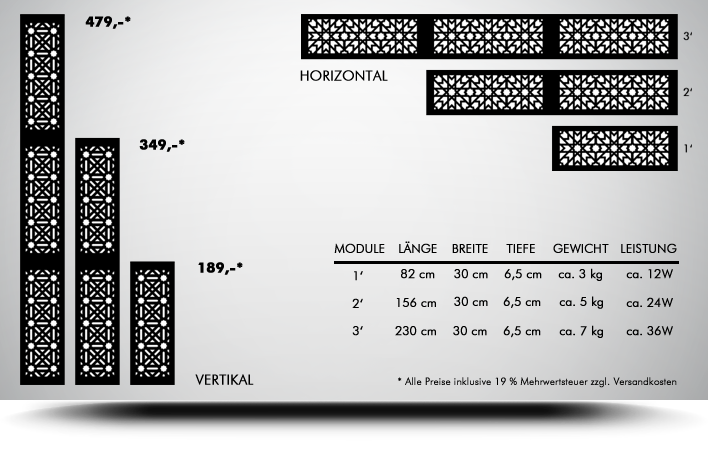 LegendeDie handgefertigten orientalischen Lampen der Marke ORIENTLY, entworfen von der Innendesignerin Ayse Uslu-Marschalkowski, verleihen jedem Wohn- oder Geschäftsraum ein extravagantes Ambiente. Hier treffen sich die Moderne der Innenraumgestaltung und der Flair des Orientalischen und sorgen gemeinsam für einen angenehm eleganten ”Lichtblick”. Die Möbel von ORIENTLY sind dekorative Gestaltungselemente und Wandleuchten zugleich, die ihre Funktion bei Tageslicht und auch bei Dunkelheit angenehm dezent erfüllen. Passend zum modern-orientalisch inspiriertem Interieur schafft die Produktserie ORIENTLY die Voraussetzung für eine harmonische und besinnliche Raumatmosphäre. Sie können Ihrer Kreativität freien Lauf lassen. |